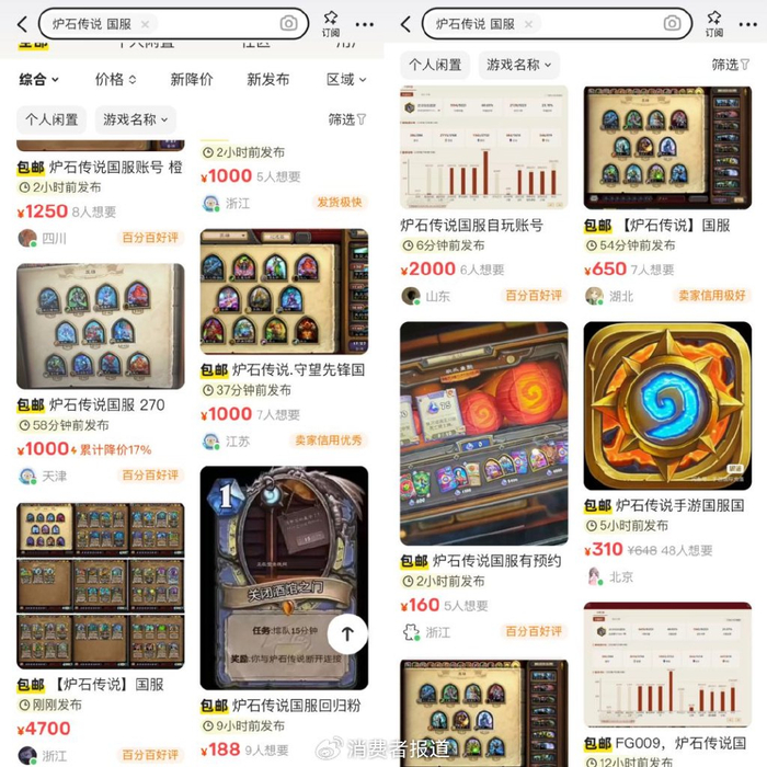 一名资深老玩家张翔(化名)告诉《消费者报道》记者,其游戏账号拥有数百张卡牌和近十万的“自由尘”,在游戏中,粉尘是一种非常重要的资源,可以用来制作新卡牌或者强化已有卡牌。张翔表示,其已在外服建立了账号并拥有更多的卡牌,因此决定不再继续在国服里投入更多的金钱。最终,张翔以4500元的价格成功出售了他的国服账号。