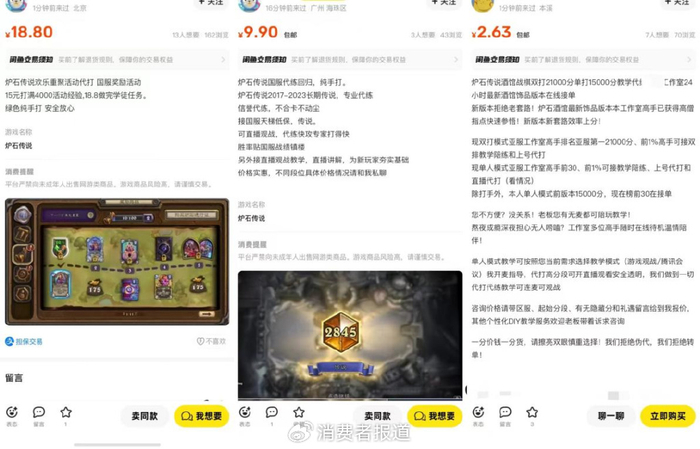 《消费者报道》记者在某二手平台了解到,有部分游戏工作室正瞄准《炉石传说》的代练生意:“炉石传说换了重聚活动代打,28.8元打满4000活动经验”“绿色纯手打,安全放心”“安全代挂通行证,每周10元,每月40元”……记者以玩家身份向游戏代练咨询相关代练业务,对方表示可随时上号开打。