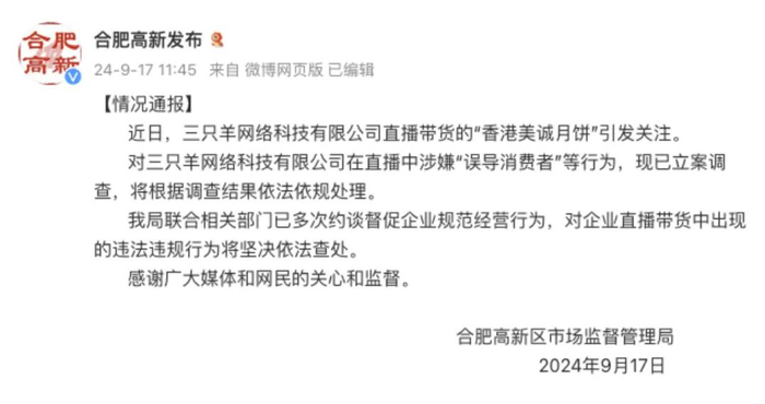 9月17日,合肥高新区市监局发布通报,对三只羊在直播中涉嫌误导消费者等行为,立案调查。