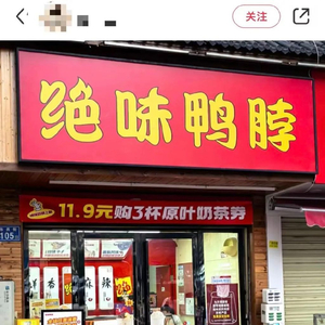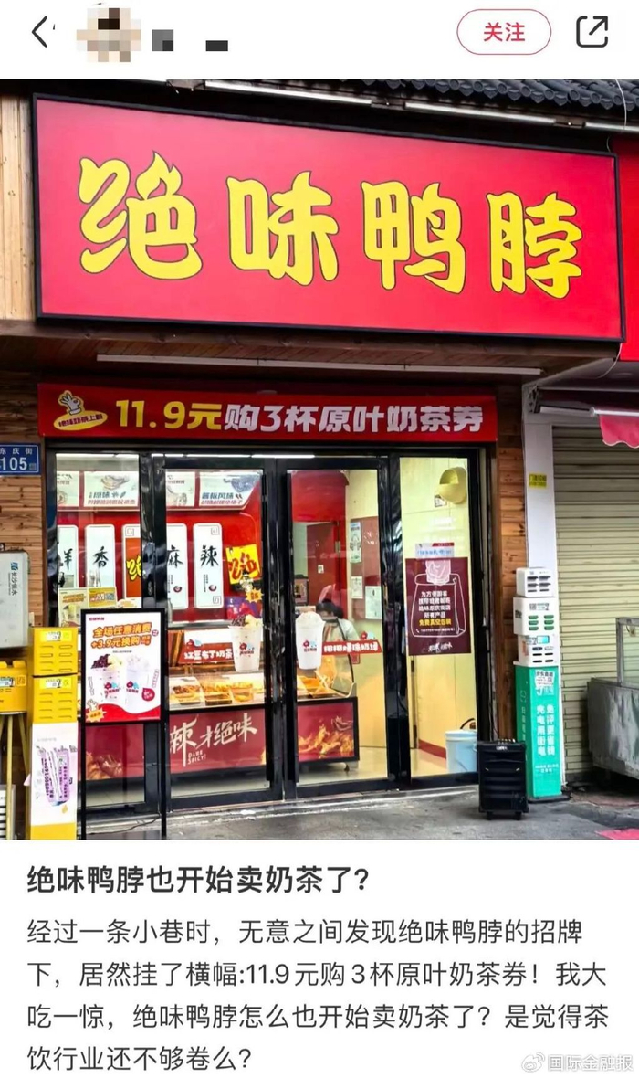 近日,社交媒体上有网友晒出绝味鸭脖门头照片,照片里门头下方的红色横幅写着“11.9元购3杯原叶奶茶券”大字。