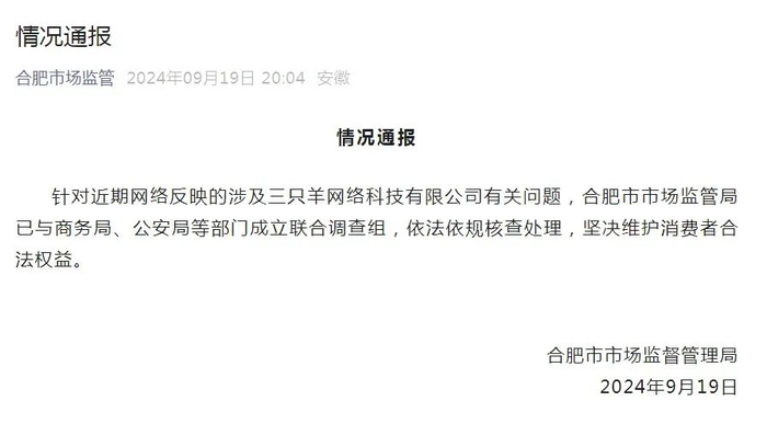 合肥市市场监督管理局9月19日通报,针对近期网络反映的涉及三只羊网络科技有限公司有关问题,合肥市市场监管局已与商务局、公安局等部门成立联合调查组,依法依规核查处理,坚决维护消费者合法权益。