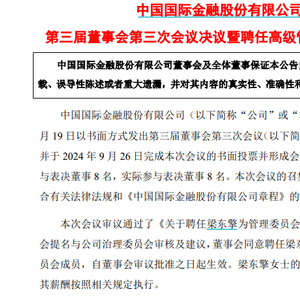 公告显示,中金公司于2024年9月19日以书面方式发出第三届董事会第三次会议,会议审议通过了《关于聘任梁东擎为管理委员会成员的议案》。