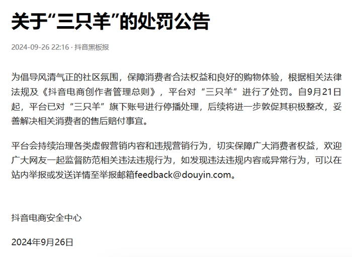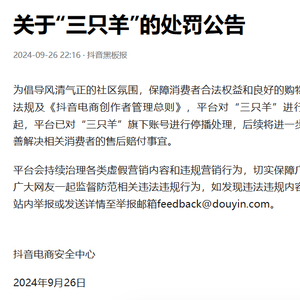 9月26日,抖音电商安全中心发布公告称,为倡导风清气正的社区氛围,保障消费者合法权益和良好的购物体验,根据相关法律法规及《抖音电商创作者管理总则》,平台对“三只羊”进行了处罚。自9月21日起,平台已对“三只羊”旗下账号进行停播处理,后续将进一步敦促其积极整改,妥善解决相关消费者的售后赔付事宜。