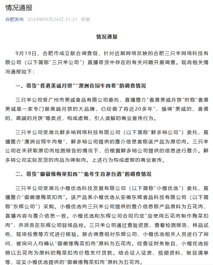 此前,合肥市联合调查组9月26日发布情况通报称,9月19日,合肥市成立联合调查组,针对近期网络反映的合肥三只羊网络科技有限公司(以下简称“三只羊公司”)直播带货中存在的有关问题开展调查。