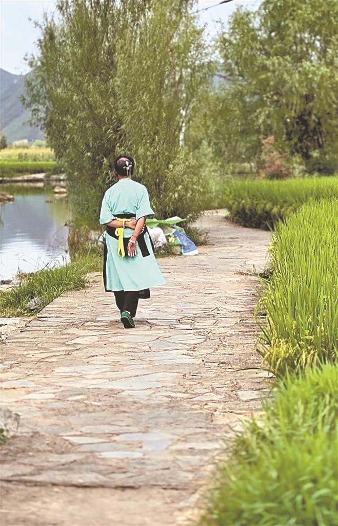 我在鲍家屯寨墙外的水碾房前拍下了一个屯堡妇女的背影。穿着的还是600年前的凤阳汉装,长衣大袖,丝头系腰。河风掀动她的衣角,她不疾不徐,越走越远。