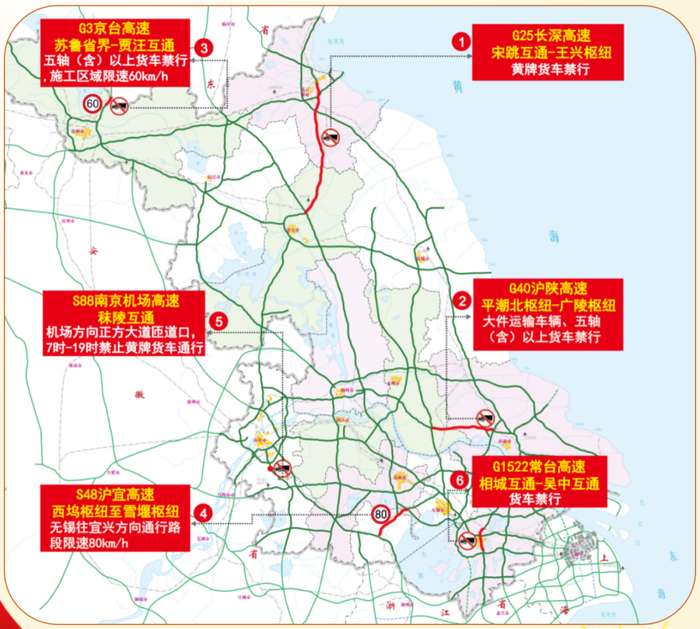 国庆期间,江苏高速对危化品运输车全路网全时段禁行。部分重要路段、节点实施交通管制政策,相关车辆假日期间请勿驶入限行路段。