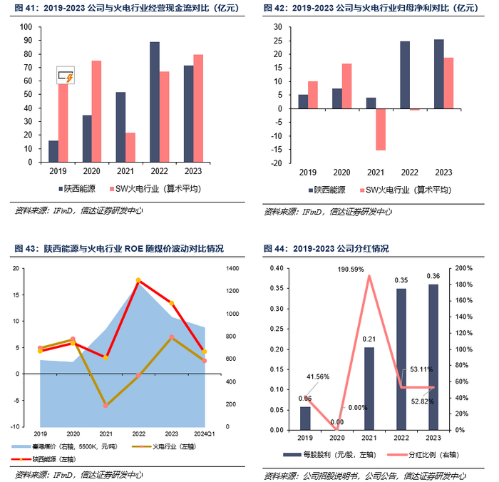 综合来看,公司的核心竞争力突出,主要体现在:1)灵活一体化:公司煤炭和煤电装机部分呈“煤电联营”模式运营(自产煤炭运至自有电厂,内部结算),其消耗自用煤比例可根据当地煤价波动情况自行调整,具有灵活性。2)当地格局优:晋陕蒙煤炭产量增速出现逐年下滑,但公司在运煤矿储量可观,在建/规划煤炭产量逐步推进,在煤炭供给格局中位置较好。陕西省电力需求增速稳定,主要供给依赖火电;而公司火电装机位居省内第二位,且与省内火电装机占比第一位的大唐陕西分公司存在机组参股联营,在电力供给格局中位置同样较佳。3)成长不间断:公司煤矿产能投产和电厂投建依次进行。2024年投产清水川三期200万千瓦煤电,2025年投产赵石畔煤矿600万吨/年,2026年投产商洛二期+延安热电二期202万千瓦煤电,2027年有望投产赵石畔二期200万千瓦煤电。产能逐步扩张有望持续给公司业绩带来成长动力。4)财务状况佳:受益于煤电一体经营模式,公司ROE、经营性现金流较可比公司更为稳定,进而为公司持续高分红提供有力支持。且公司目前资产负债率仍处于较低水平,财务杠杆空间充足,后续资产成长及注入可期。