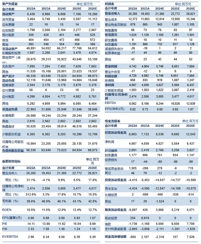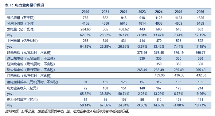 电力价格和成本:我们预计2024-2026年电价有望维持高位,陕西省电价(不含税)分别为376.46/370.19/360.77元/兆瓦时;送湖北省电价(不含税)分别为350/350/350元/兆瓦时;送山东电价(不含税)分别为330/330/330元/兆瓦时;送安徽电价(不含税)分别为265.49/265.49/265.49元/兆瓦时;江西省电价(不含税)分别为439.96/436.30/432.63。考虑到公司煤电一体化比例持续提升,煤炭逐步由外售转为自用,我们预计度电燃料成本分别为111.93/103.14/105.41元/兆瓦时。