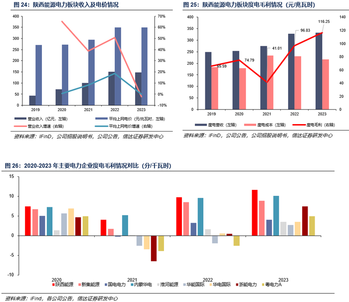 发电收入:市场化改革推进提升电价上浮空间,煤电一体化运营平抑燃料价格波动。2021 年 10 月,国家发改委印发《关于进一步深化燃煤发电上网电价市场化改革的通知》(发改价格[2021]1439 号),推动燃煤发电量全部进入电力市场,并将煤电“基准价+上下浮动”的浮动范围扩大至上下浮动20%,同步提高煤电上浮“天花板”。得益于电力市场化改革推进,陕西省年度电力交易电价由2021年的340.85元/兆瓦时上浮至2023年的410.64元/兆瓦时,公司平均电价也由2021年的295元/兆瓦时(不含税)上浮至2023年的350元/兆瓦时(不含税)。公司发电业务收入同时受益于电改带来的电价上行和电厂投产带来的电量增长,2023年公司实现电力营业收入147.70亿元。此外,公司在2021-2023年自用煤比例持续上行,煤电一体化运营程度得以提升。受益于电价收入上行而成本管控良好,公司度电毛利由2021年的41.01元/兆瓦时(不含税)提升至2023年的116.25元/兆瓦时(不含税)。横向对比来看,公司度电毛利相较于同类纯火电公司与煤电一体公司,同样具有相对优势。