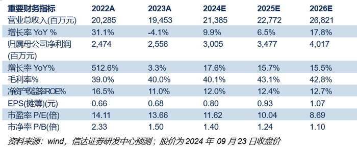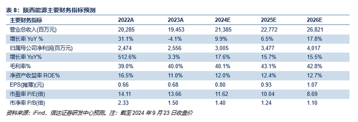 陕西能源作为陕投集团控股的西北煤电一体运营龙头,其煤炭资产优质储量大,煤电电价可观成本管控较强,叠加未来煤炭煤电产能持续落地,稳健经营的同时又具有高增长潜力。我们预测公司2024-2026年归母净利润分别为30.05/34.77/40.17亿元;EPS分别为0.80/0.93/1.07元/股;对应9月23日收盘价的PE分别为11.62/10.04/8.69倍。
