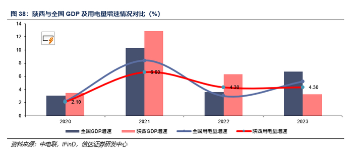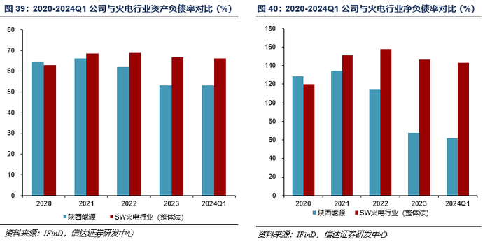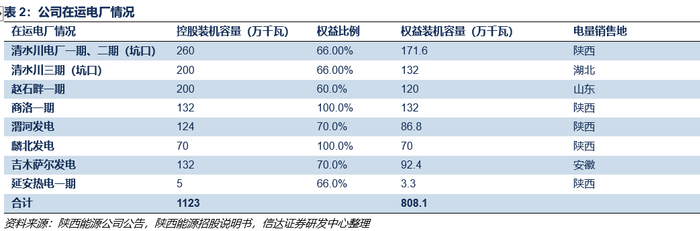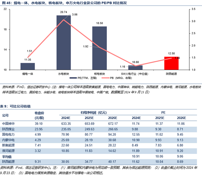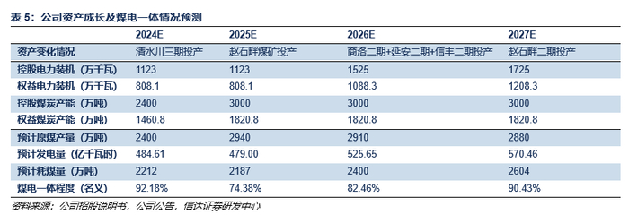 公司核心竞争力突出:灵活一体化,当地格局优,成长不间断,财务状况佳。公司的核心竞争力主要体现在四方面:1)灵活一体化:公司煤炭和煤电装机部分呈“煤电联营”模式运营(自产煤炭运至自有电厂,内部结算),其消耗自用煤比例可根据当地煤价波动情况自行调整,具有灵活性。2)当地格局优:晋陕蒙煤炭产量增速出现逐年下滑,但公司在运煤矿储量可观,在建/规划煤炭产量逐步推进,在煤炭供给格局中位置较好。陕西省电力需求增速稳定,主要供给依赖火电;而公司火电装机位居省内第二位,且与省内火电装机占比第一位的大唐陕西分公司存在机组参股联营,电力供给格局中位值同样较佳。3)成长不间断:公司煤矿产能投产和电厂投建依次进行。2024年投产清水川三期200万千瓦煤电,2025年投产赵石畔煤矿600万吨/年,2026年投产商洛二期+延安热电二期202万千瓦煤电,2027年有望投产赵石畔二期200万千瓦煤电。产能逐步扩张有望持续给公司业绩带来成长动力。4)财务状况佳:受益于煤电一体经营模式,公司ROE、经营性现金流较可比公司更为稳定,进而为公司持续高分红提供有力支持。且公司目前资产负债率仍处于较低水平,财务杠杆空间充足,后续资产成长及注入可期。