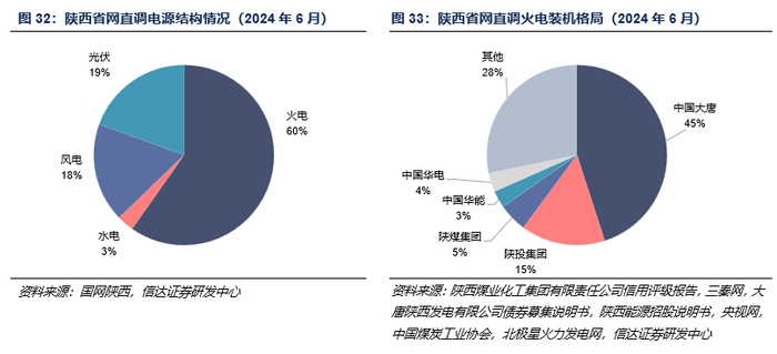 陕西电力供应格局:火电占比超六成,供应格局较优。从电力装机角度看,陕西作为西北内陆省份,电力结构以火电和新能源为主。据国网陕西分公司,截至2024年6月,陕西电网直调电厂总装机容量6481.61万千瓦。其中,火电装机容量3873万千瓦,水电装机容量196.75万千瓦,风电装机容量1151.9万千瓦,光伏装机容量1259.97万千瓦。而在直调装机中占比占六成的火电,其供应格局较优。其中,大唐集团装机1743万千瓦,占比约45%;陕投集团装机586万千瓦,占比约15%,全部归于煤炭电力上市公司平台陕西能源(不含外送机组清水川三期、赵石畔一期、新疆吉木萨尔电厂)。
