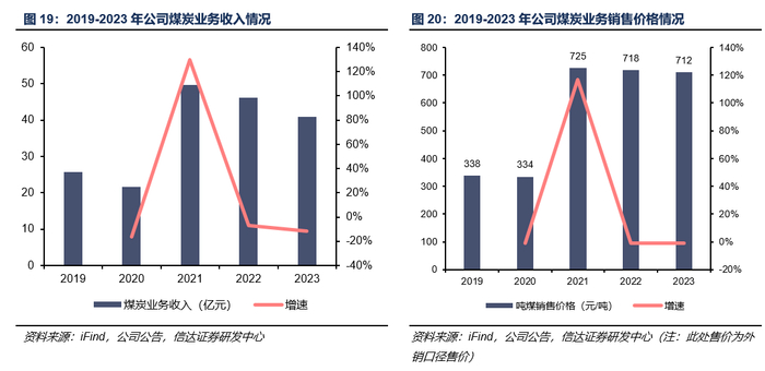 煤炭销售价格:内销全部长协,外售部分现货。公司煤炭销售方面,配套坑口电厂的自用煤部分直接计入煤电一体(清水川能源)中;转运到自有电厂的自用煤部分目前以长协价格结算;对公司外部客户的外售煤中包含部分长协煤和现货煤。受益于煤价明显上行,2021年公司煤炭业务收入达49.64亿元,同比增长129.92%。虽然2022-2023年公司外售煤逐步减少,但吨煤售价基本保持稳定。2023年公司外售煤吨煤售价达712元/吨。