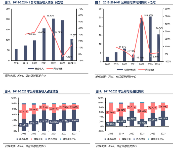 受益于煤炭和煤电产能逐步释放,2018年以来公司营收和利润稳步增长。受益于煤炭和煤电产能逐步释放,公司营收从2018年的55.63亿元成长至2022年的202.85亿元。但2021年煤炭产能持续引发煤价上涨,电力板块利润下滑导致归母净利同比下行。2022年随着电改政策推进,煤电电价浮动空间打开,电力板块盈利改善带动公司归母净利同比大幅上行。2023年受煤价电价回落影响,公司营收略降至194.53亿元,但公司整体净利保持平稳。2024年H1随着园子沟东翼转入正式运行带来煤炭产量提升,清水川三期首台机组投产带来电量同比持续增发,公司营收及归母净利持续增长。上半年公司实现营业收入105.75亿元,同比+14.36%;归母净利润实现15.41亿元,同比+16.70%。煤炭业务方面,2024年H1实现自产煤外销量380.64万吨,同比+62.41%。电力业务方面,2024年H1公司上网电量224.85亿千瓦时,同比+12.23%。