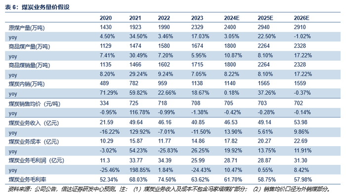 煤炭产销量:考虑到赵石畔煤矿有望如期于2025年投产,我们预计未来公司煤炭产量有望自2025年后有所增长。2024-2026年,原煤产量分别为2400/2940/2910万吨;商品煤销量预计为1800/2264/2328万吨;煤炭内销逐年增加,分别为1140/1565/1559万吨。