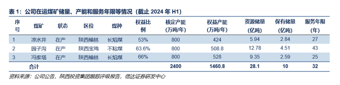 公司煤炭资源概况:集中在陕西中部和北部,储量较为可观。集团煤炭生产与销售业务完全由陕西能源负责运营。截至 2024年Q1,公司下属主要在产矿井3座,分别为冯家塔煤矿、凉水井煤矿和园子沟煤矿。其中,冯家塔煤矿为清水川煤电一体化项目配套煤矿,位于陕西省榆林市府谷县,属低瓦斯矿井,矿井保有资源量9.35亿吨,保有储量2.59亿吨,煤种为长焰煤,属优质动力煤。凉水井煤矿位于陕西省榆林市神木市,矿井保有资源量5.94亿吨,保有储量2.84亿吨,核定生产能力800万吨/年,煤质属低灰低硫低磷的高热值不粘煤或长焰煤。近年来,凉水井煤矿产量相对稳定。园子沟煤矿位于陕西省宝鸡市麟游县,矿井保有资源量12.78亿吨,保有储量4.51亿吨,核定生产能力800万吨/年。目前,该矿井西翼600万吨/年生产项目已于2020年11月正式投产,矿井东翼200万吨/年项目于2024年上半年投入正式运行。综合来看,公司煤炭板块核定产能2400万吨/年,权益产能1460.8万吨/年,煤质较优,矿井平均服务年限达32年,资源储量较为可观。