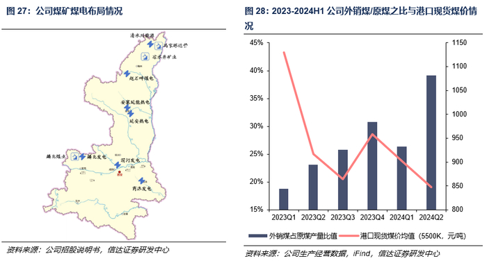 如前所述,公司煤炭销售分为三部分:煤矿配套坑口电厂的煤电一体模式,内部煤炭转运自有电厂的煤电联营模式,以及对公司外部客户的煤炭外销模式。除冯家塔煤矿配属清水川能源外,园子沟和凉水井煤矿在供给内部电厂的同时也对外销售煤炭。从年度煤炭自用比例来看,由于煤炭产能周期持续,煤价上行幅度较大,2019-2023年公司外销比例不断降低。但分季度来看,随着港口现货煤价在2023年有所下行并逐步趋稳,公司2023-2024H1分季度外销煤占原煤比值有所上行,至2024Q2更是提高至39.18%。综合来看,公司的煤炭销售渠道和煤电燃料采购渠道均较为灵活,在煤价上行时通过降低煤炭外销提升煤电一体比例,从而稳定煤电成本;在煤价下行时亦可使电厂自行就近外购煤炭,进而通过降低自用煤部分的运费来控制煤炭成本。因此,公司可实现煤炭自用/外销比例灵活调节,进而实现公司整体收益最大化。
