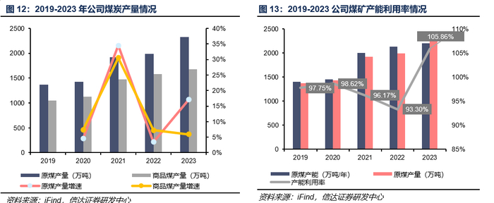 煤炭产量:产能产量同比持续上行,产能利用率维持高位。2019-2023年受益于公司煤矿不断投产进而释放产能,公司原煤产量由1368万吨上升至2329万吨,商品煤产量由1052万吨上升至1674万吨。2024年H1,公司实现原煤产量1165.38万吨,同比上升3.35%。随着上半年园子沟煤矿东翼转入正式运转,煤炭板块产量有望持续增长。2019-2023年,公司煤炭产能利用率长期维持90%以上,产能利用率维持高位。