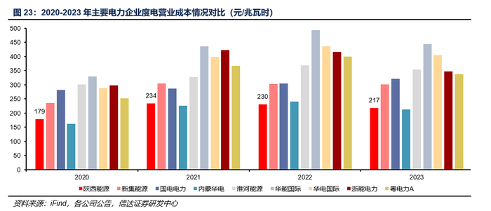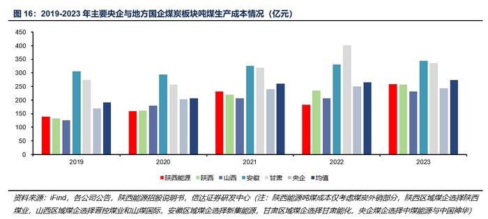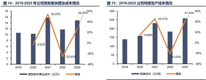 煤炭生产成本:耗材辅料采购及劳务采购逐年增加,导致生产成本持续上升。整体来看,公司煤矿主要集中在陕北榆林与渭北地区,当地煤炭具有低硫、低磷、低灰、高热值等特性,资源禀赋优势较佳,吨煤开采成本较低。2019-2023年,公司煤炭板块营业成本由10.61亿元上升至14.86亿元。虽然煤炭外销量同步持续上涨,但由于2020年园子沟煤矿投产,导致煤炭生产所需耗材辅料开支和洗选煤加工服务采购费用有所提升,叠加凉水井、冯家塔煤矿综采工作面增加,整体煤炭板块生产成本持续上升,吨煤生产成本由2019年的139.03元/吨上涨至2023年的258.89元/吨。但考虑到煤炭单吨成本波动主要与公司各煤矿开采方式与开采难度等因素相关,对比各煤炭公司煤炭单吨成本,中部晋陕蒙煤矿相对开采成本仍处于较低水平。其中,陕西能源开采成本低于行业平均,成本优势凸显(仅考虑煤炭外销部分)。