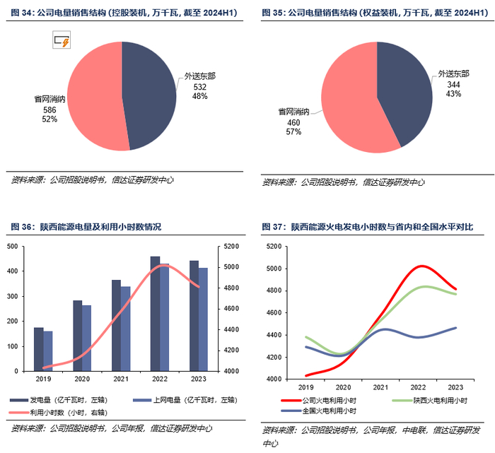 上网电量展望:陕西电力需求刚性凸显,外送东部电量消纳有保障。如前所述,公司电量部分上陕西省网,部分外送至东部地区消纳,其中外送东部地区的控股装机占比和权益装机占比均近半。从省内电力需求看,火电为陕西省内主力电源。长期以来,省内用电量需求持续增长为火电机组利用小时数逐年升高提供刚性支撑。2021年以来,陕西火电发电小时数持续高于全国平均水平,而公司火电发电小时持续高于省内平均水平。2019年以来,受益于电厂逐步投产运营和机组平均利用小时数逐步升高,公司发电量逐年走高,2023年实现上网电量414.41亿千瓦时。此外,据人民日报,2022年外送东部的赵石畔煤电和吉木萨尔电厂年发电小时数均达到5000小时。外送东部电量消纳受东部用电需求增长支撑,配套电源机组利用小时有望获得持续保障。