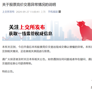 9月27日11时许,“上交所发布”微信公众号发布“关于股票竞价交易异常情况的说明”,全文如下: