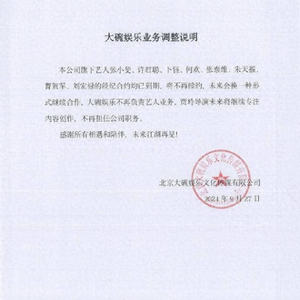 9月27日,大碗娱乐发布业务调整说明,公司旗下艺人张小斐、许君聪、卜钰、何欢、张泰维、朱天福、曹贺军、刘宏禄的经纪合约已到期,将不再续约,未来会换一种形式继续合作。贾玲未来将继续专注内容创作,不再担任公司职务。贾玲、张小斐等艺人转发表示“我们来日方长”。