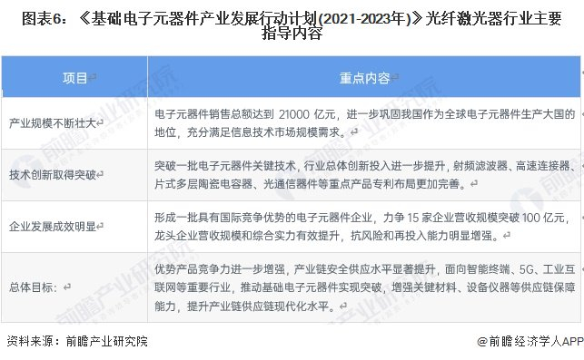 2021年6月,工信部发布了《基础电子元器件产业发展行动计划(2021-2023年)》,在《行动计划》中,工信部对于光纤激光器所在的电子元器件行业的发展做出了整体规划。其中与光纤激光器行业相关举措如下: