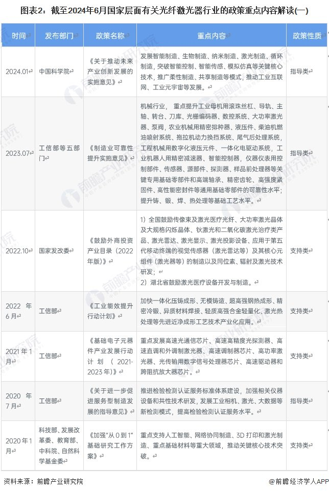 激光器的用途十分广泛,目前可应用于材料加工、通讯、传感、研发、军事、医疗等领域,为了促进行业活力,加快行业发展,国家各部门出台了多项促进光纤激光器行业发展的扶持性政策。截至2024年6月我国光纤激光器行业重点政策如下: