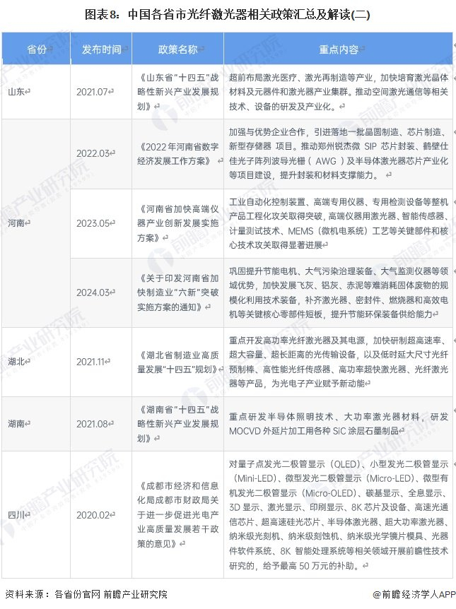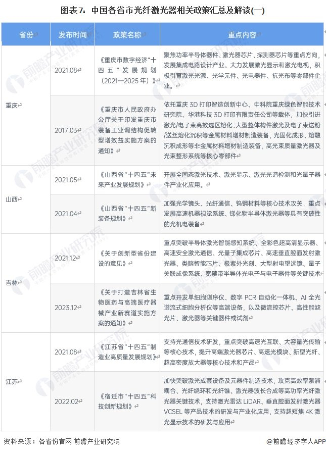 光纤激光器属于半导体激光器制造业中的一种,技术门槛相对较高,国内仅有山东、广东、重庆、山西、陕西、湖北、湖南等地有针对性的发展规划。目前,我国主要省市光纤激光器相关政策如下表所示:
