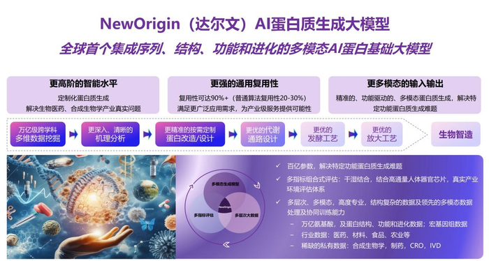 NewOrigin大模型是分子之心自研的面向生物经济时代的基础设施级底层大模型,也是全球首个集成序列、结构、功能和进化的多模态AI蛋白基础大模型。它拥有百亿级参数,学习了海量高度专业、复杂的多模态数据,可针对产业应用需求,在几小时内、甚至是分钟级“定制”具有特定功能的各类蛋白质,成功率高、普适性强、使用门槛低,为生物经济领域智能化升级带来革命性的工具。