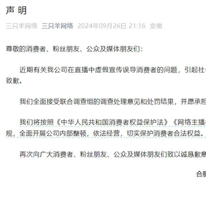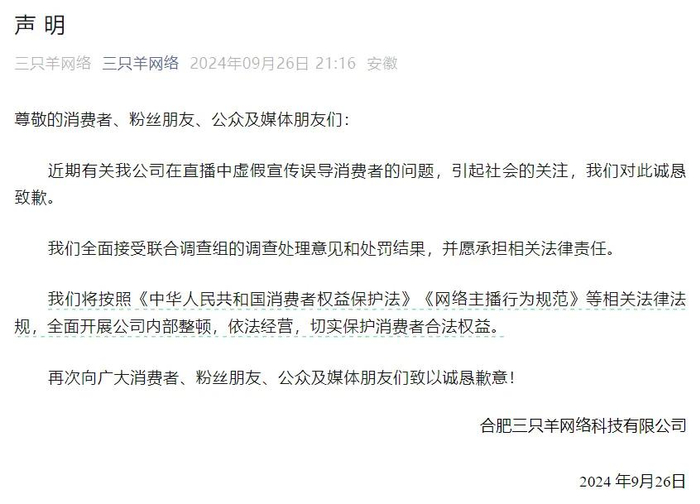 随后,三只羊公司发布声明,就近期公司在直播中虚假宣传误导消费者的问题致歉。该公司称,将全面接受联合调查组的调查处理意见和处罚结果,并愿承担相关法律责任;将按照《中华人民共和国消费者权益保护法》《网络主播行为规范》等相关法律法规,全面开展公司内部整顿,依法经营,切实保护消费者合法权益。