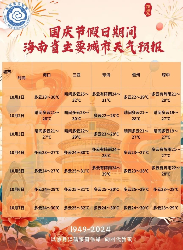 海南省气象台预计,国庆假日期间,无热带气旋、强降雨、强冷空气影响海南省陆地,海南岛以多云天气为主,中部和东部地区部分时段有阵雨,温度适宜,有利于出行和户外活动。