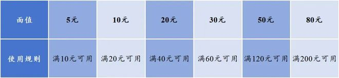 共推出四种券面:一是50元面额,餐饮消费满300元每次抵用一张;二是100元面额,餐饮消费满500元每次抵用一张;三是200元面额,餐饮消费满800元每次抵用一张;四是300元面额,餐饮消费满1000元每次抵用一张。