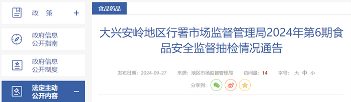 黑龙江省大兴安岭地区行署市场监督管理局2024年第6期食品安全监督抽检情况通告