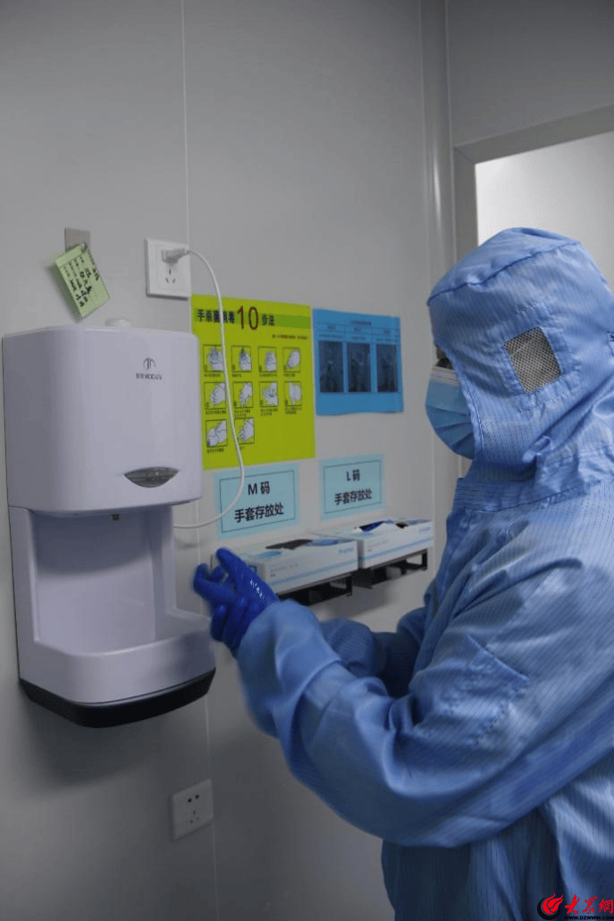 通过走廊,来到进入车间的第二道关,那就是更鞋室。在这里要将脚上穿的鞋子换掉,穿上工厂准备的“无菌鞋”,然后进入更衣室,这也就是通常意义上的“第三关”。在这里,进入的工作人员要更换洁净服,戴上一次性无纺布头套和手套,换上洁净服,然后进行消毒,才能进入车间。