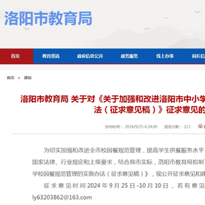 为切实加强和改进全市校园餐规范管理,提高学生供餐服务水平,维护学生合法权益,依据有关国家法律、行业规定和上级要求,结合我市实际,洛阳市教育局拟制了《关于加强和改进洛阳市中小学校园餐规范管理的实施办法(征求意见稿)》,现公开征求意见和建议。