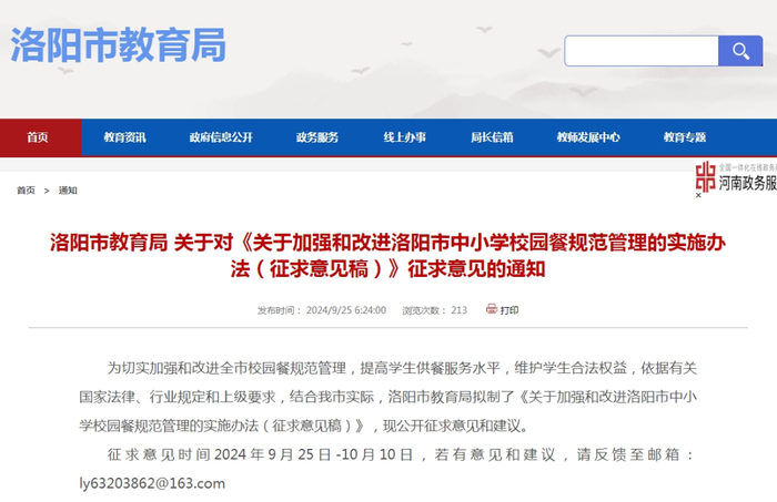 关于中小学校园餐,洛阳市教育局发布通知!