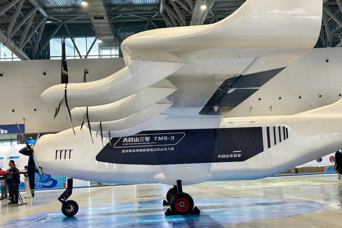 天目山三号(TMS-3)是天目空卡(杭州)智能科技有限公司联合航空浙江省实验室(天目山实验室)全新研制的全球首款吨级超级混动货运无人机,集成了航空浙江省实验室(天目山实验室)动力、机载、飞机、材料等方面的最新技术,采用先进的分布式推进吹翼增升技术、超级混合动力技术、飞发一体化综合控制技术等。通过分布式螺旋桨改变机翼流场,通过飞发一体化设计,形成动力与气动的耦合收益,增强抗失速能力,极大增加最大升力系数,实现了整机超短距起降(STOL)的能力,使其能够在比足球场还小的极短跑道上起飞和降落,甚至是大型舰船、大型建筑物顶部起降,这大大提高了飞机的灵活性,降低了对机场跑道等基础设施的依赖,极大扩展了其使用场景。天目山三号相较于EVTOL能耗需求大幅下降,又保留了固定翼大载重长航时的优点,是当前最有前途的货运飞机解决方案。