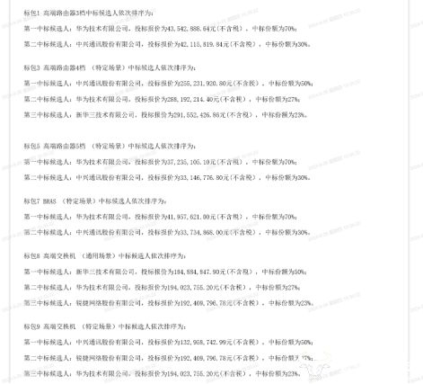 也就是说,本次采购项目总中标金额约10.99亿元。其中,华为中标份额最多,总中标金额最高;中兴紧随其后,新华三和锐捷位列第三名和第四名。