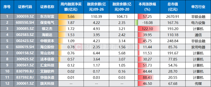 注:近4日创上市以来最高单日成交额记录的个股周内融资余额变动(融资余额截至9月26日,其余数据截至9月27日收盘)