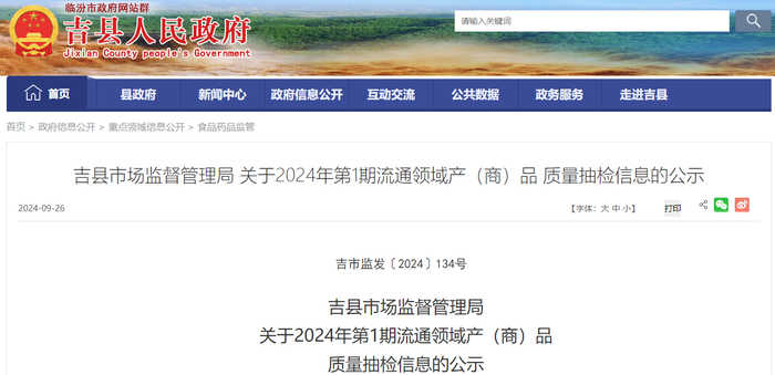 山西省吉县市场监督管理局关于2024年第1期流通领域产(商)品质量抽检信息的公示