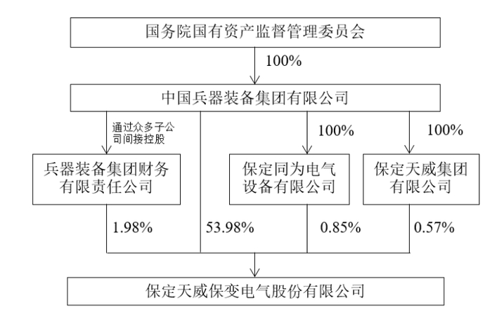 保变电气主营输变电装备业务,主要从事变压器及配件的制造与销售,是兵器装备集团唯一的输变电业务平台。无偿划转前,后者对保变电气的直接持股比例为53.98%,通过子公司间接持股合计3.4%;同为公司成立于2013年,由兵器装备集团100%控股,持有保变电气1572.24万股股份,在后者总股数中占比0.85%。
