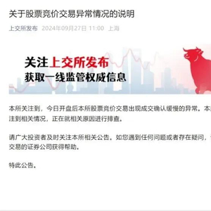 上午11时整,上交所发布关于《关于股票竞价交易异常情况的说明》:“本所关注到,今日开盘后本所股票竞价交易出现成交确认缓慢的异常。本所已在第一时间关注到相关情况,正在就相关原因进行排查。”
