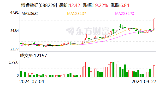 沪深交易所2024年09月27日公布的交易公开信息显示,博睿数据因成为日涨幅达到15%的前5只证券上榜。博睿数据当日收报42.42元,涨跌幅19.22%,换手率2.74%,成交额4888.62万元。