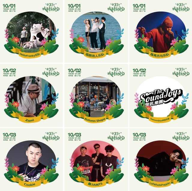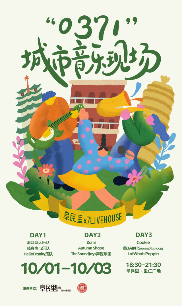 从春节的柔软生长到中秋微微盛开,10个月不断地自我更新与焕新,在这个十一国庆的假期里繁花绽放,阜民里联动本地音乐现场地标品牌7LIVEHOUSE,打造“0371”城市音乐现场,搭配“城市绿洲花园”式舞台设计,3天,独立、优雅,潮流3大主题,9支在地ZUI强风格乐队持续展演,只为带给大家不一样的假期松弛感,创造城市的超级音乐IP。