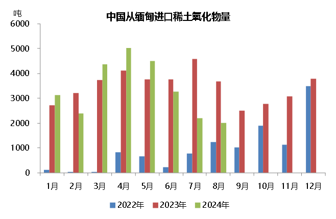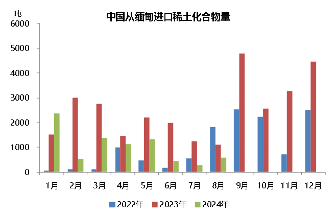 2024年1-8月份,我国从缅甸进口2.7万吨稀土氧化物,同比下降9%,占同期氧化物总进口量的74.5%,进口品种全部为“未列名氧化稀土”;1-8月,我国从缅甸进口8088吨稀土化合物,同比减少47.2%,占比达48.4%,进口品种全部为“其他未列名稀土金属及其混合物的化合物”。据测算,今年前8个月,我国从缅甸进口的稀土原料中(稀土氧化物和稀土化合物),REO总含量同比下降约13.2%。