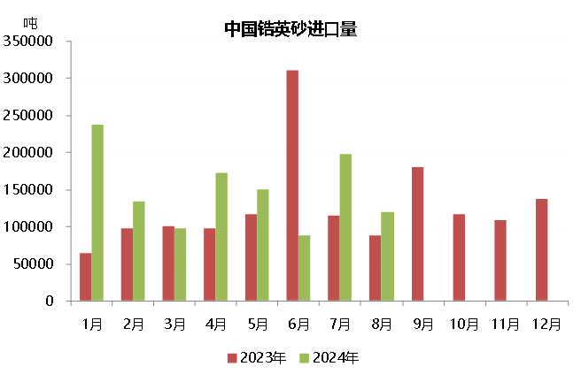 2024年1-8月份,我国进口120万吨锆英砂,同比增长21%。其中,8月份,锆英砂进口量为12万吨,环比减少39.4%,同比增长37.5%。
