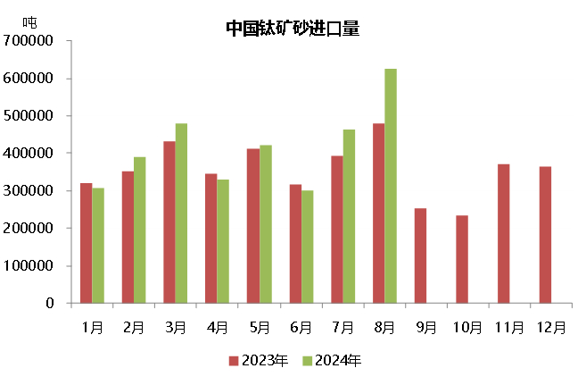我国进口的钛矿砂和锆英砂所含的独居石伴生矿也是稀土生产的重要原料之一。2024年1-8月份,我国进口331.6万吨钛矿砂,同比增长8.7%。其中,8月份,钛矿砂进口量为62.5万吨,环比增加34.7%,同比增加30.6%。