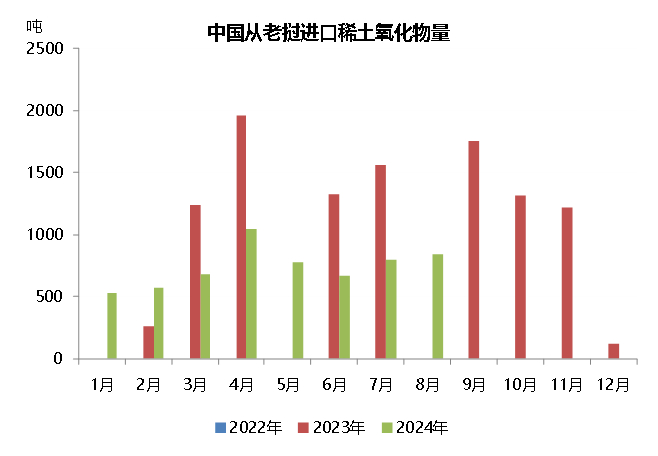 2023年2月以来,我国开始从老挝进口稀土氧化物和化合物。2024年1-8月份,我国从老挝进口5900吨稀土氧化物,同比下降7.1%,占同期氧化物总进口量的16.3%,进口品种全部为“未列名氧化稀土”;8月,老挝稀土氧化物进口量为845吨,环比增加5.8%,去年同期未有进口。今年以来,我国仅1月份从老挝进口115吨稀土化合物。