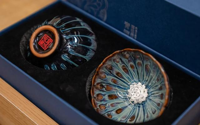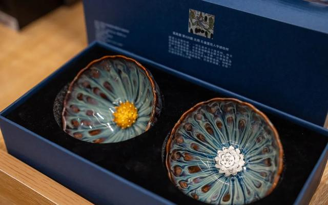 莲杯天成,对饮相伴,这款双盏杯采用莫高窟第428窟孔雀莲花人字披纹样,金银相对,流光溢彩。